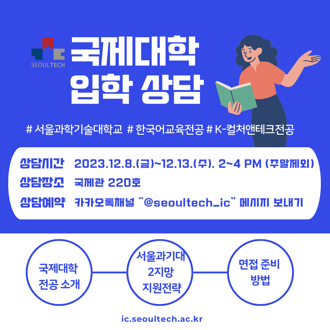 입학 상담을 희망하는 외국인 학생들은 카카오톡 채널로 메시지 보내주세요. 서울과기대와 국제대학, 전공에 대한 소개도 듣고, 국제대학의 멋진 기념품도 받아가세요~ ^^