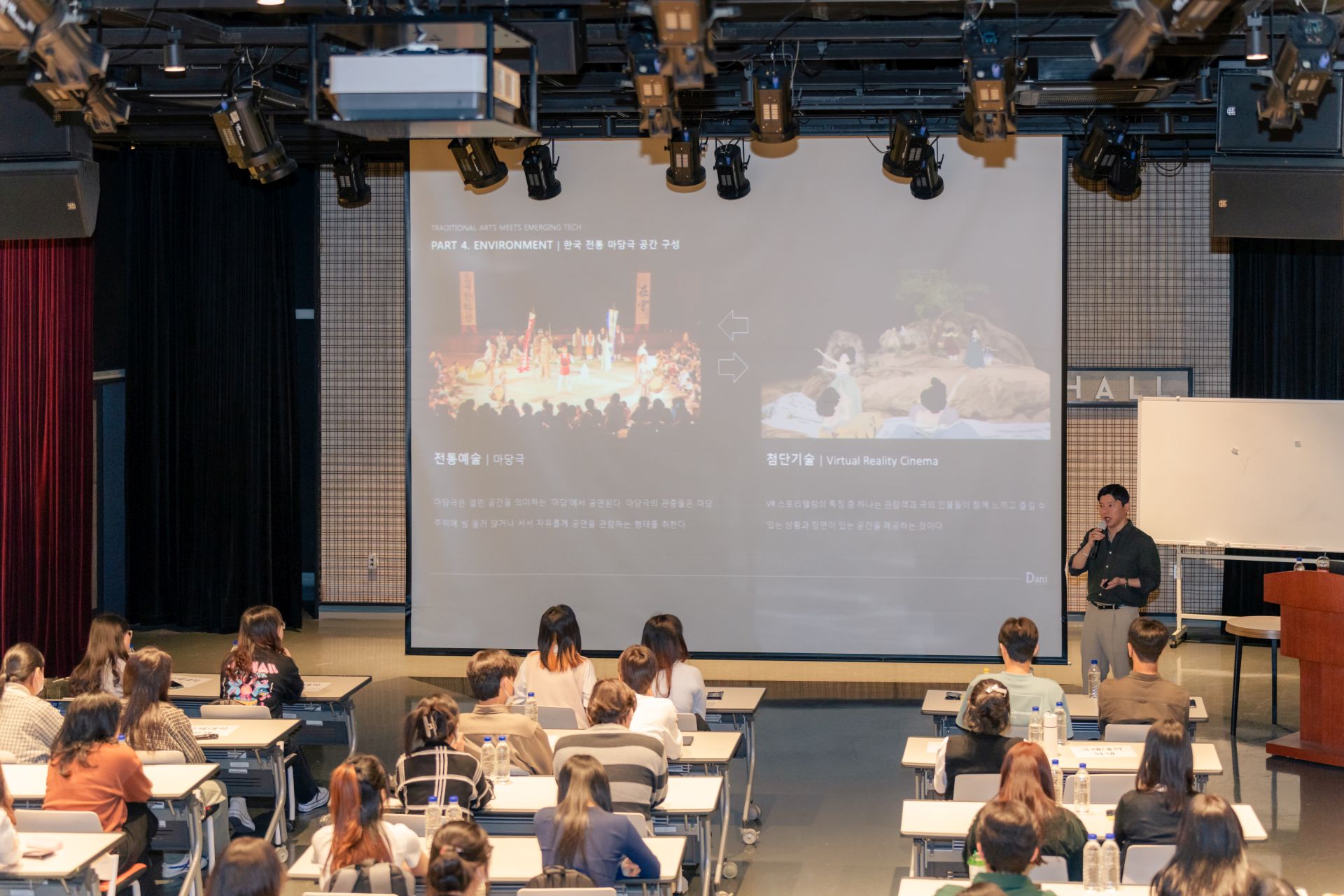 2024. 5. 14.(화)에 실시된 제2회 국제대학 언어문화 콜로키움(ILCC)에서는 서경대학교 유상현 교수님이 '영화감독이 들려주는 예술과 VR영화의 세계'란 주제로 한국전통예술과 첨단기술을 융합한 영화와 제작 과정 등에 대해 소개해주셨어요.