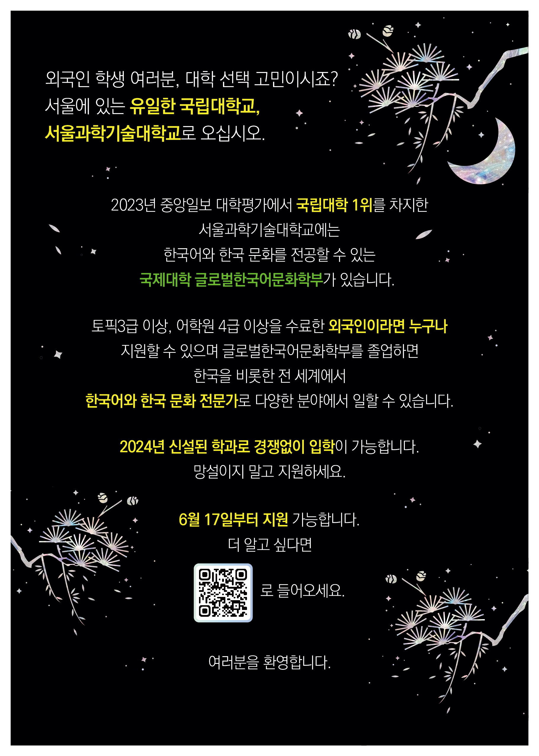 외국인 학생 여러분, 서울에 있는 유일한 국립대학교, 서울과학기술대학교로 오십시오.