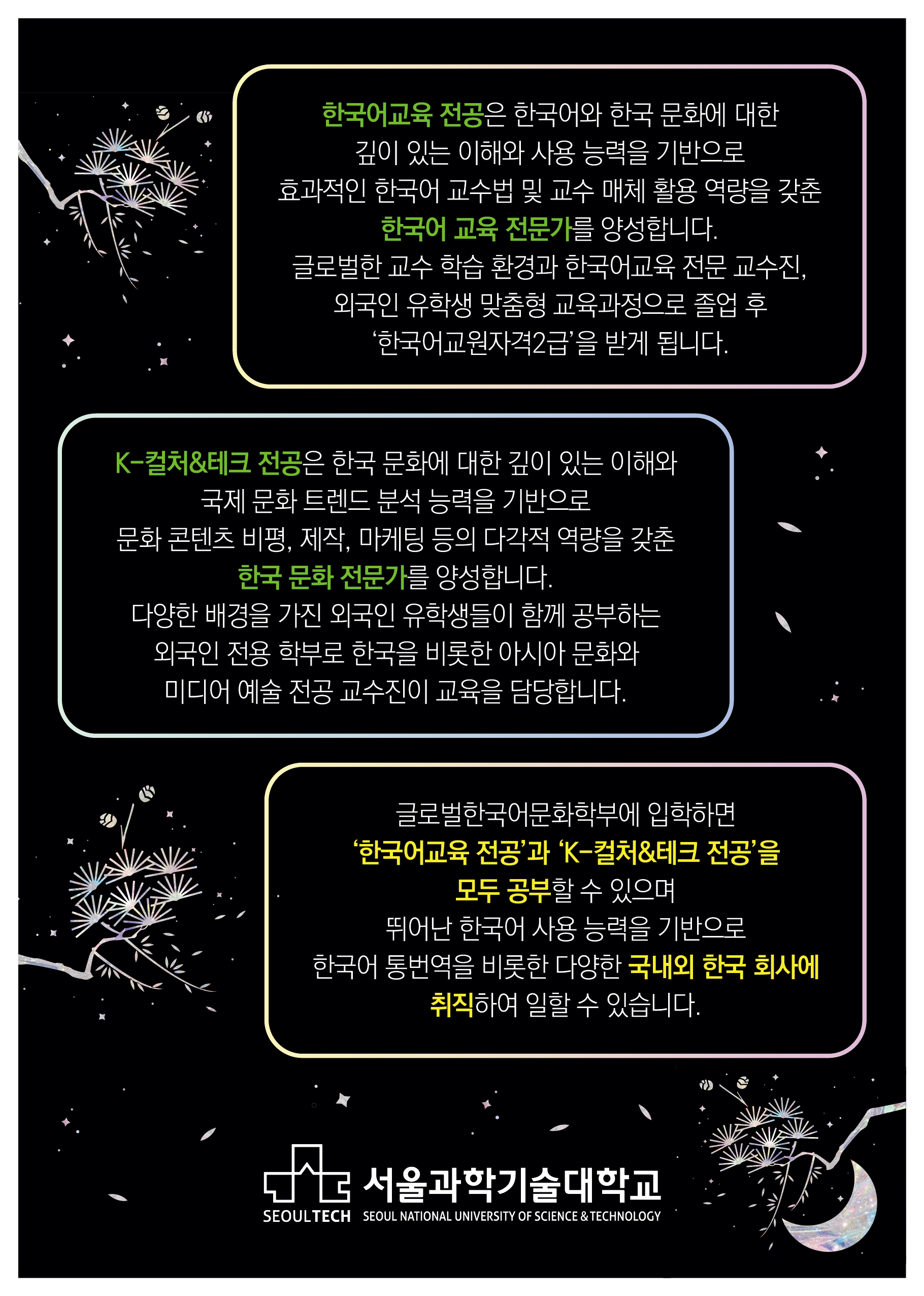토픽3급 이상, 어학원 4급 이상을 수료한 외국인이라면 누구나 지원할 수 있으며, 글로벌한국어문화학부에 입학하면 '한국어교육 전공'과 'K-컬처앤테크 전공'을 모두 공부할 수 있으며, 졸업 후에는 국내외 한국 회사에 취직하거나 전 세계에서 한국어와 한국문화 전문가로 다양한 분야에서 일할 수 있습니다.