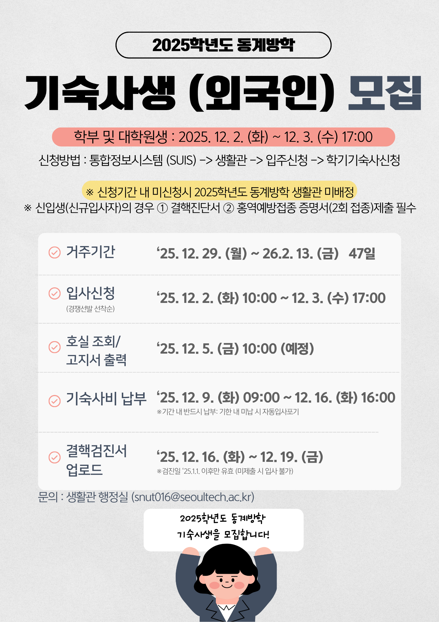 2025학년도 동계방학 기숙사생(외국인)을 아래와 같이 모집하오니, 기숙사 입주를 희망하는 학생은 신청기간 내에 반드시 신청하시기 바랍니다!