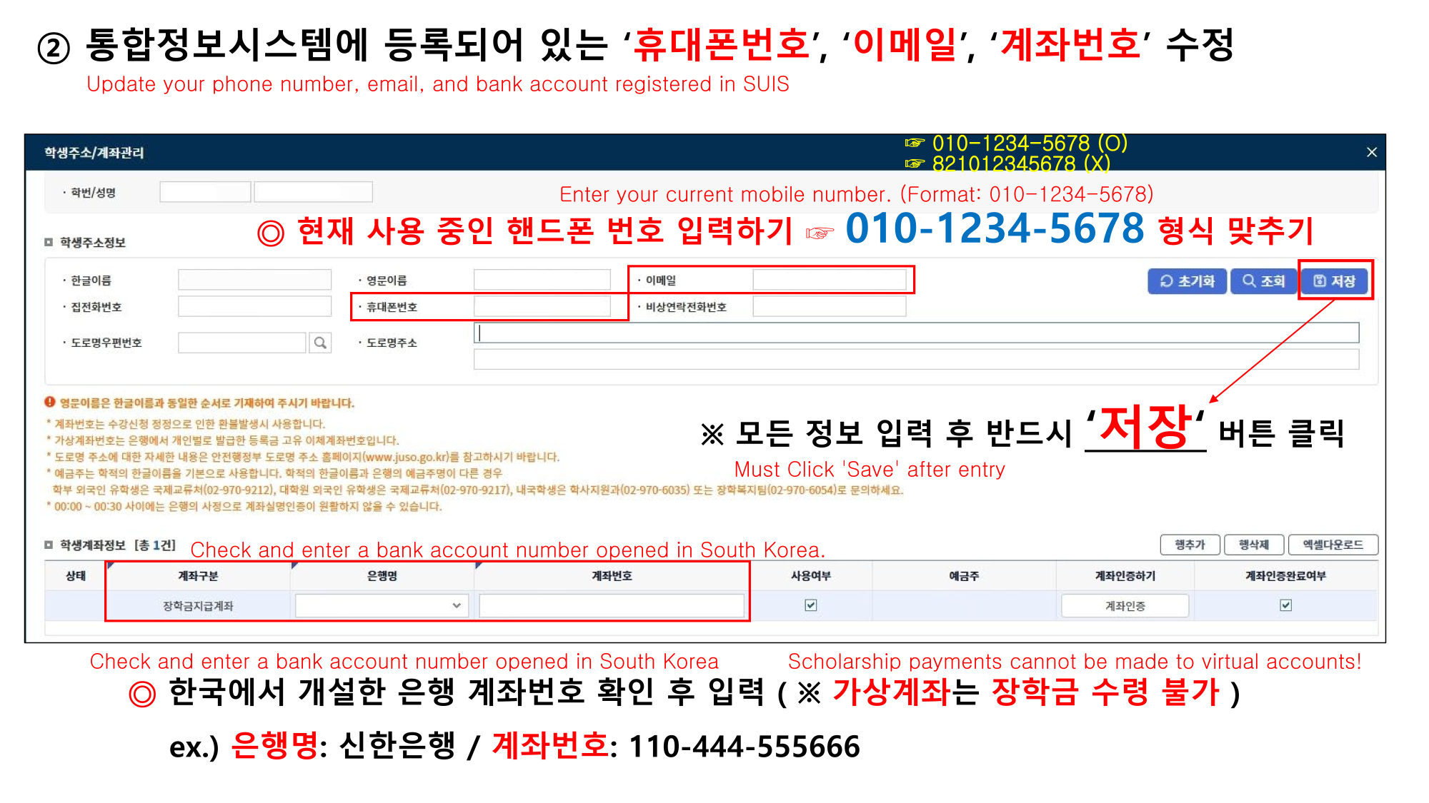통합정보시스템(SUIS) > 학사 > 학적 > 나의정보 > 학생주소/계좌관리