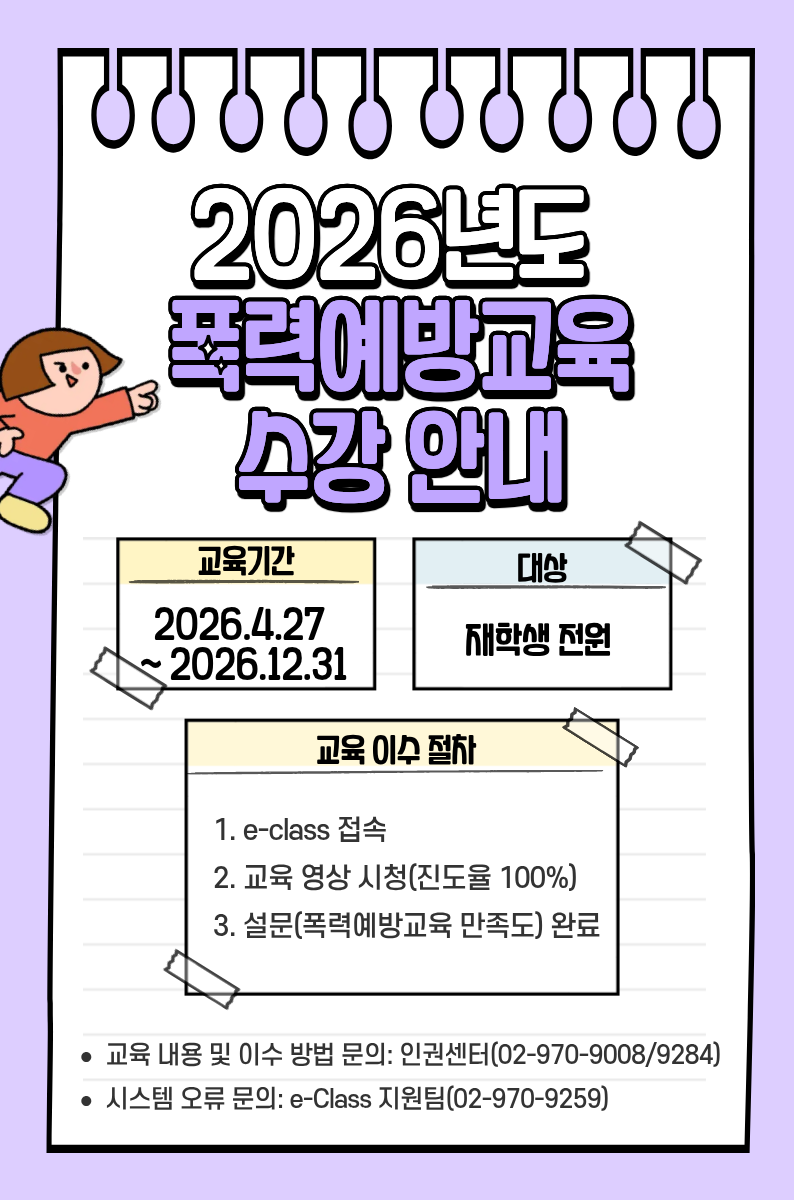 서울과학기술대학교 인권센터에서 시행하는 '학생 대상 폭력예방 필수교육' 이수 관련 안내입니다.
